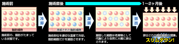 脂肪冷却を受けると、凍って死滅した脂肪細胞が不要物として、からだの外に排出されていく仕組みです。